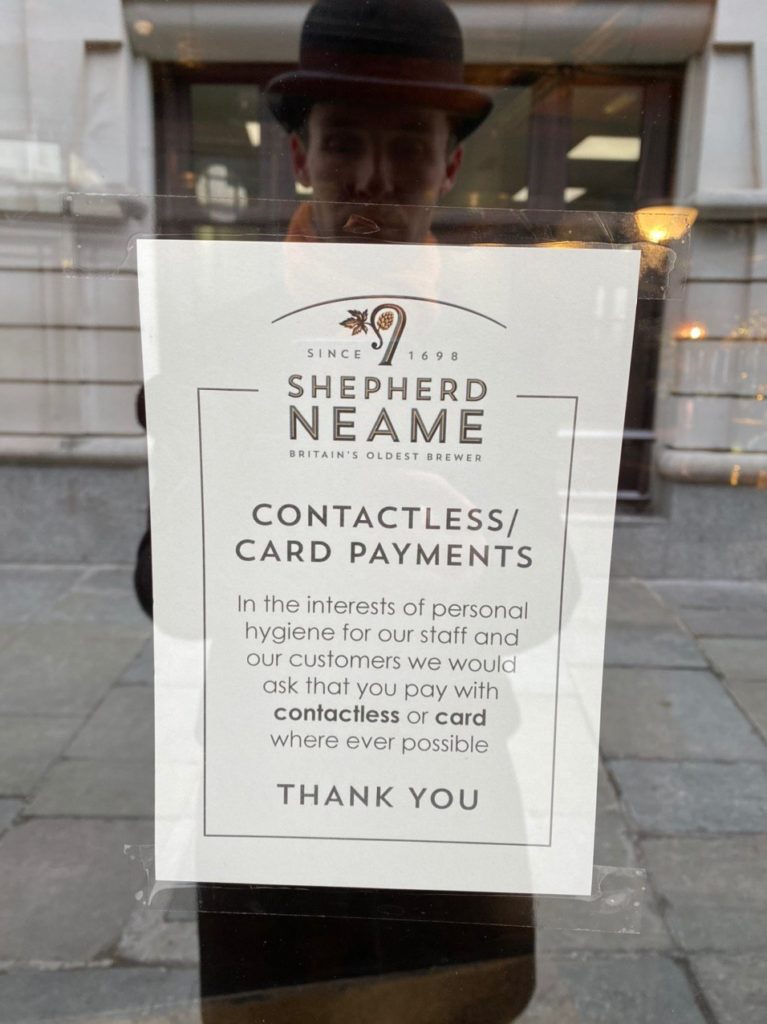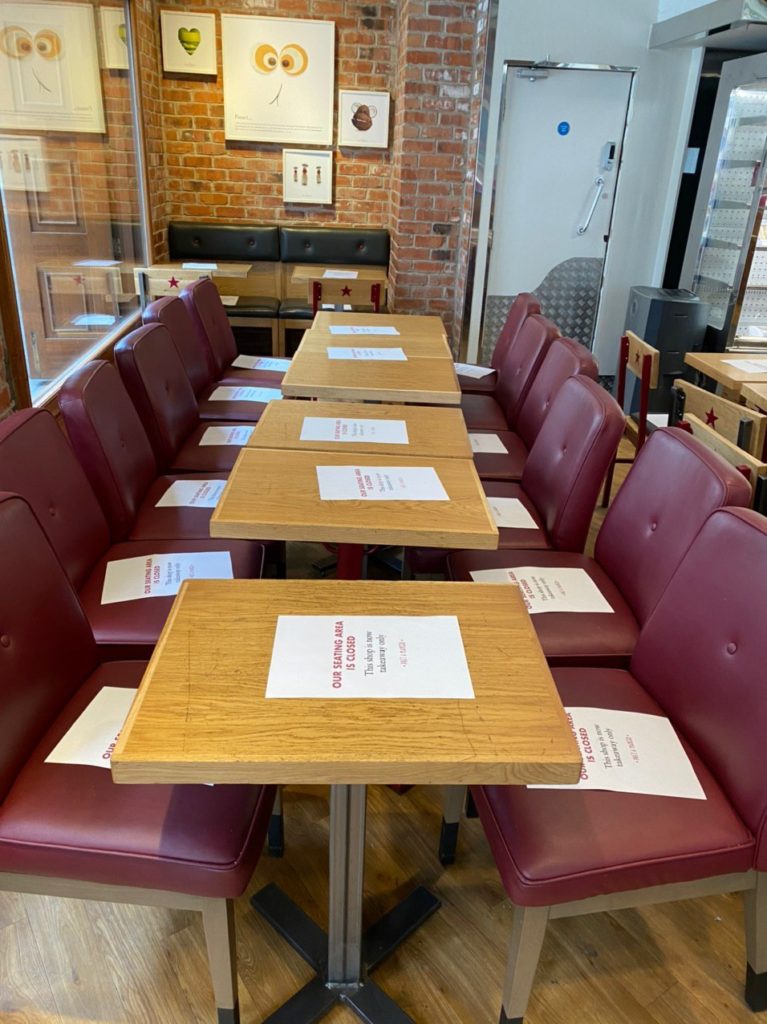 Кофейни / сендвичные Pret все еще работают, но только на вынос. На каждом столе и стуле сообщение, что сидеть тут больше нельзя, так что с кофе на выход плиз.