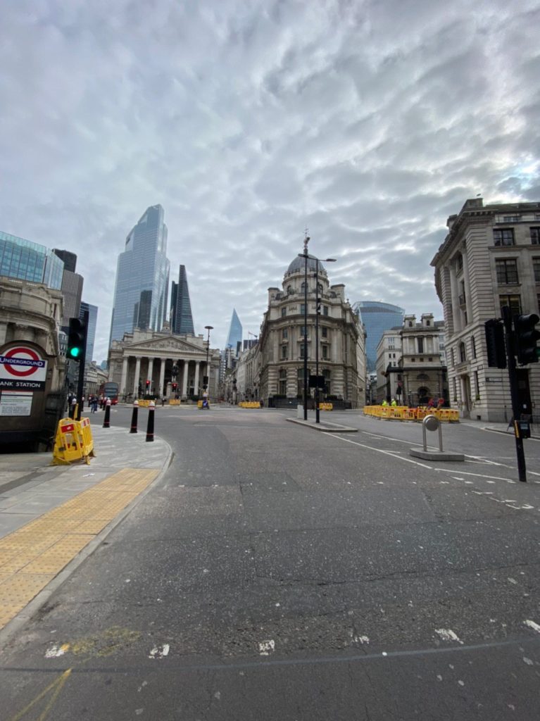 Самая звенящая тишина — на метро Bank. Там есть адовый перекресток, на котором вечные пробки из машин, автобусов и людей. Сегодня там ветер гуляет.